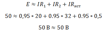 Пример 1. Два резистора подключены к источнику постоянного напряжения 50 В, с внутренним сопротивлениемr= 0,5 Ом