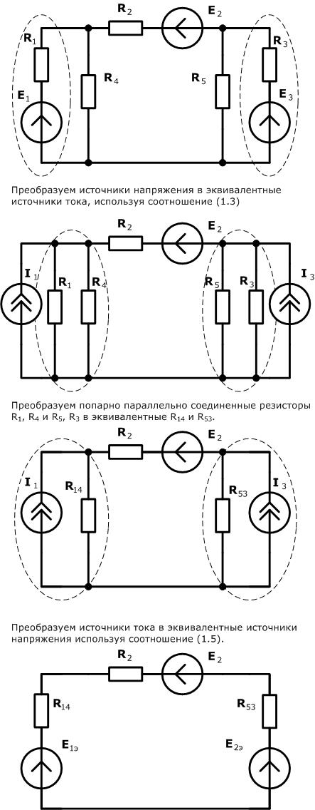 Схематичный пример использования метода эквивалентного преобразования схемы для расчета сложной электрической цепи изображен ниже: