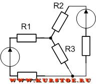 Удаляем соединение сопротивлений треугольником. В результате остается подключение сопротивлений звездой. По формулам рассчитываются значения сопротивлений R1, R2, R3.