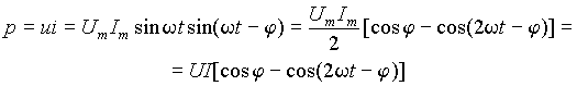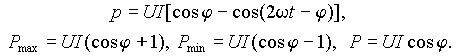 Отсюда следует, что мгновенная мощность изменяется с двойной частотой сети относительно постоянной составляющей UI cosj равной средней или активной мощности. При cosj = 1 (j = 0), т.е. для цепи, обладающей чисто резистивным сопротивлением