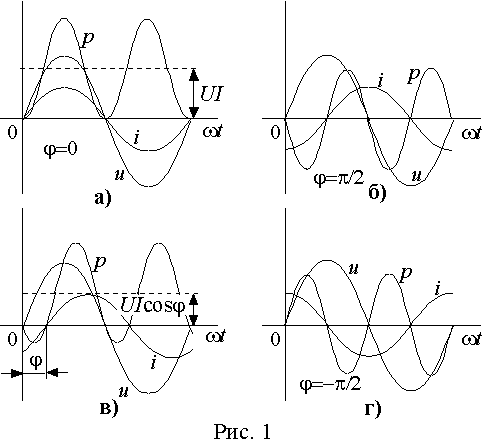 Временные диаграммы, соответствующие чисто индуктивной и чисто емкостной нагрузке приведены на рис. 1 б) и г). Из выражений (8) и временных диаграмм следует, что мощность колеблется относительно оси абсцисс с двойной частотой, изменяя свой знак каждые четверть периода. Это означает, что в течение четверти периода (p > 0) энергия поступает в электрическую цепь от источника и запасается в магнитном или электрическом поле, а в течение следующей четверти (p < 0) она целиком возвращается из цепи в источник. Так как площади, ограниченные участками с положительной мощностью и с отрицательной одинаковы, то средняя мощность отдаваемая источником нагрузке равна нулю и в цепи не происходит преобразования энергии. В общем случае произвольной нагрузки 1 > cosj > 0 (1< |j | < p /2) и