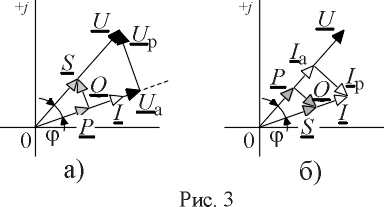 В отличие от всегда положительной активной мощности, реактивная мощность положительна при j > 0 и отрицательна при j < 0. Из условия равенства переменных составляющих левой и правой частей уравнения (10) можно найти связь между P, Q и S = UI в виде