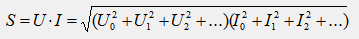 Как известно, реактивная мощность Q синусоидального тока характеризует интенсивность колебаний энергии (Q=ω Wmax) с частотой ω между элекромагнитным полем элемента и остальной цепью. В цепи несинусоидального тока колебания энергии происходят на разных частотах. Сложение реактивных мощностей отдельных гармоник, характеризующих колебания энергии на разных частотах, лишено физического смысла. Математически может получиться, что реактивные мощности отдельных гармоник имеют разные знаки и в сумме дают нуль, хотя колебания энергии при этом имеют место. Таким образом, для цепи несинусоидального тока понятие реактивной мощности лишено физического смысла. Для цепи несинусоидального тока применяется также и понятие полной мощности, которая определяется как произведение действующих значений напряжения и тока: