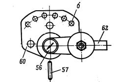 Рис. 4. Складання важеля крана: 56 — вісь 07-70/ П-472; 57 — штифт 07-94/ П-472; 60 — кронштейн 07-71/ П-472; 62 — важілець 07-73/ П-472; б — отвір