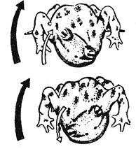 Для выявления эндогенной обусловленности формирования двигательной активности зародышей производились интересные опыты на эмбрионах саламандр: пересаживались зачатки конечностей таким образом, что последние оказывались повернутыми в обратную сторону. Если бы формирование их движений определялось эмбриональным упражнением (путем афферентной обратной связи), то в ходе эмбриогенеза должна была бы произойти соответствующая функциональная коррекция, восстанавливающая способности к нормальному поступательному движению. Однако этого не произошло, и после вылупления животные с повернутыми назад конечностями пятились от раздражителей, которые у нормальных особей обусловливают движение вперед. Сходные результаты былиполучены и у эмбрионов лягушек: перевертывание зачатков глазных яблок на 180° привело к тому, что оптокинетические реакции оказались у этих животных смещенными в обратном направлении (рис. 19).