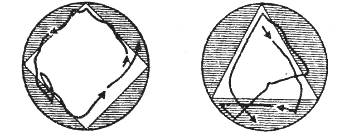 Рис. 29. Фобическая реакция эвглены при внезапном изменении освещения (по Джен-нингсу) Способность к индивидуальному изменению описанных генетически фиксированных форм поведения путем научения выражена у простейших слабо. Все же способность простейших к научению, хотя бы в элементарных формах, сейчас можно считать доказанной. Если, например, держать парамеции некоторое время в треугольном или квадратном (в сечении) сосуде, то они сохраняют привычный путь передвижения вдоль стенок сосуда и после их перемещения в сосуд округлой формы (рис. 30). Аналогичным образом инфузория, плававшая длительное время (около двух часов) в сосуде, имевшем форму треугольника, придерживается этой траектории затем и в квадратном сосуде большей площади (опыты немецкого ученого Ф. Брамштедта). В опытах советской исследовательницыН.А. Тушмаловой инфузории были подвергнуты постоянно действующему ритмичному раздражителю — вибрации. В результате животные постепенно переставали реагировать на него обычным образом (сокращением). Исследовательница усматривает в этом пример элементарных следовых реакций, представляющих собой простую форму кратковременной памяти, формирующейся на этом уровне филогенеза за счет чисто молекулярных взаимодействий Подобные опыты ставились и другими экспериментаторами, применявшими различные формы воздействия. Высказывались сомнения, действительно ли в таких случаях можно говорить о каких-то формах научения, ибо сильные воздействия могли оказать хотя бы временное вредное влияние на подопытных животных. К тому же вообще в опытах с простейшими очень трудно учесть все возможные побочные факторы (особенно химические изменения среды).