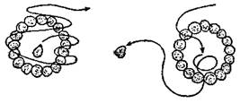 Рис. 37. Мнемотаксис у роющей осы Philanthus. После отлета осы кольцо из шишек вокруг норки было перемещено в сторону. После возвращения оса ищет норку внутри кольца и находит ее лишь после повторных облетов (опыт Тинбергена)