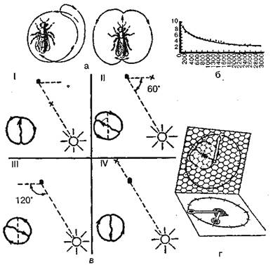 Рис. 38. «Танцы пчел». Обозначения: а — «круговой танец» (слева) и «виляющий» (справа); б — интенсивность выполнения «виляющих танцев» как показатель расстояния до местонахождения источника пищи (на оси ординат отмечено число «танцев» за 15 секунд, на оси абсцисс — расстояние до пищи в метрах); в — «виляющий танец» как показатель направления полета к источнику пищи: I — навстречу солнцу, II — под углом 60° налево от положения солнца, III — направо от положения солнца, IV — от солнца. Точка — местонахождение улья, крестик — местонахождение пищи. Изображение «танцев» следует представить себе на вертикальной плоскости (по Фришу); г — схема, иллюстрирующая транспозицию угла полета по отношению к положению солнца (горизонтальная плоскость) на вертикальную плоскость сот, на которых пчела выполняет «виляющий танец» (по Кэстнеру) бей об этих свойствах. Несмотря на всю сложность и точность, система коммуникации медоносной пчелы в принципе не отличается от любой другой системы общения у животных. Переводятся ли истинные пространственные параметры в сигналы, воспринимаемые с помощью зрения, осязания и чувства силы тяжести, как это имеет место у медоносной пчелы, или же в сигналы, воспринимаемые хеморецепцией (муравьи), — информация в любом случае передается в трансформированном, условном виде. Здесь как нельзя нагляднее выступают характер и функциональное значение психики у животных.