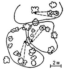 Рис. 40. Территориальное поведение муравьев (Acantholepis melanogaster). Территории трех семей с нейтральными зонами между ними. Точки — гнезда; крестики — колонии тлей, посещаемые муравьями; замкнутые кривые — кустарник; пунктирные линии — основные направления поиска и транспортировки пищи (по Захарову) Наибольшую сложность территориальное поведение достигло у рыжих лесных муравьев, у которых наблюдается и наибольшая плотность особей на кормовых участках. Охраняемые территории этих муравьев достигают значительно большей величины, чем у других видов. Центральными элементами такой территории являются муравьиные тропы (постоянные кормовые дороги), длина которых нередко превышает 100 метров, а протяженность всей сети троп — 1 километр. Каждой дорогой пользуется лишь определенная группа муравьев («колонна»), занимающая в муравейнике определенный сектор, примыкающий к «своей» дороге. Территория всей семьи подразделяется дорогами на отдельные части, составляющие территории отдельных колонн. Между ними имеются такие же нейтральные пространства, как и между территориями семей, хотя и не столь выраженные, как в последнем случае. Границы территории маркированы и препятствуют «рассеиванию» муравьев. Муравьи двигаются по территории не хаотично, а в соответствии со структурой территории: в центральной и средней ее частях — по кратчайшему пути от дорог или муравейника, на периферии же — параллельно границам территории. Таким образом, траектория движения каждого муравья детерминируется местом нахождения его на территории (исследования И.В.Стебаева). Наибольшую охотничью активность муравьи развивают на периферии территории (далее 10 метров от гнезда). Сбор строительного материала производится в пределах двухметровой полосы вдоль дорог. Захаров справедливо отмечает сходство территориального поведения муравьев с таковым у птиц и хищных млекопитающих.
