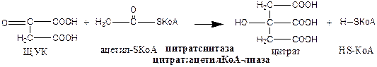 1). Цитратсинтаза локализуется в матриксе митохондрий, ее активируют ЩУК, НАД+; ингибируют АТФ, НАДН2, Сукцинил-КоА, цитрат.