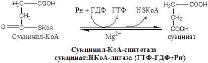 4). Окислительно-восстановительная реакция. α -кетоглутаратдегидрогеназный комплекс состоит из 3 ферментов и содержит 5 коферментов: тиаминдифосфат, кофермент А, липоевая кислота, НАД+, ФАД. α -КГ ДГ активируется Са2+, ингибируется сукцинил-КоА, АТФ, НАДН2.