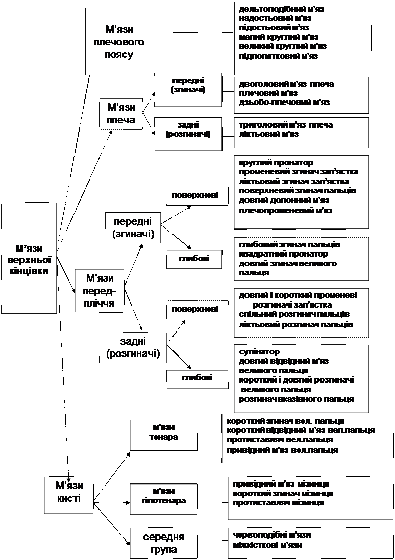 Знати: - розташування м’язів верхньої кінцівки, їхні функції; основні топографічні утворення руки. Вміти: - визначати за місцем розташуванняосновні групи м’язів верхньої кінцівки; - розв’язувати практичні завдання щодо функцій м’язів верхньої кінцівки.