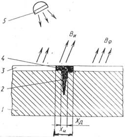 Рисунок 5.1 Люминесцентно- цветная дефектоскопия 1 - деталь, 2 – дефект заполненный пенетрантом, 3. – слой проявителя, 4. – индикаторный след, 5. – источник ультрофиолетового излучения, Вн - свечение индекаторного следа, Вф – свечение фона, Xи – размер индикаторного следа, Xд – размер дефекта на поверхности