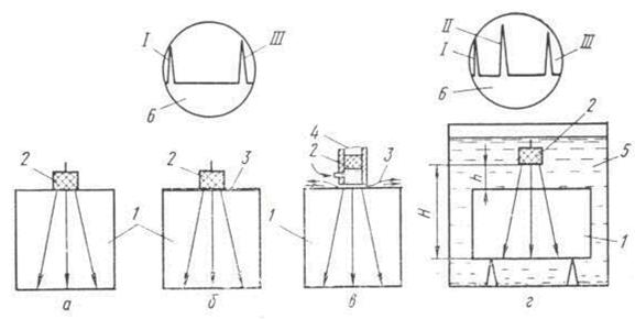 Так как время прохождения УЗК прямо пропорционально пройденному пути, а скорость их для данного материала есть величина постоянная, то горизонтальная линия на экране ЭЛТ представляет собой глубину залегания дефекта в каком-то масштабе. ВВОД И ПРИЕМ УЛЬТРАЗВУКОВЫХ ВОЛН. Ввод и прием ультразвуковых волн Рисунок 9.2 Схема ввода УЗ колебаний в изделие. – а – контактный сухой; б – контактный через тонкий слой жидкости; в – струйный; 5 – иммерсионный; 1 – контролируемое изделие; 2 – преобразователь; 3 – контактная среда; 4 – насадка для создания струи воды; 5 – ванна с водой; 6 экран дефектоскопа;; I – начальный сигнал; II – сигнал от верхней поверхности изделия; III – донный сигнал.