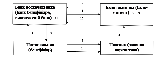 Рисунок 2.4 – Розрахунки з використанням розрахункового чека У заяві й талоні до неї чекодавець проставляє номер рахунка, з якого сплачуватимуться чеки. Гарантована оплата чеків забезпечується депонуванням коштів на окремому рахунку «Розрахунки чеками». Для цього разом із заявою на видачу чекової книжки в банк подається платіжне доручення на перерахування коштів на аналітичний рахунок «Розрахунки чеками». Покриттям чека в установі банку можуть бути також кошти на відповідному рахунку чекодавця, але не більше суми, яка гарантується банком за узгодженням із чекодавцем. В останньому випадку банк може гарантувати чекодавцю, при тимчасовій відсутності коштів на його рахунку, сплату за чеками за рахунок коштів банку. Чекотримач здає в банк чеки разом із трьома примірниками реєстрів - якщо рахунки чекодавця і чекотримача ведуться в одній установі банку, й у чотирьох примірниках (на кожну установу банку окремо) - якщо рахунки чекодавця і чекотримача ведуться в різних установах банків. Реєстр вміщує повну інформацію про чеки, що надходять до установи банку. Якщо чекодавець і чекотримач обслуговуються в одній установі банку, після перевірки правильності складання реквізитів чека і реєстру кошти списуються з відповідного рахунка чекодавця та зараховуються на рахунок чекотримача на підставі першого примірника реєстру. Для здійснення розрахунків чеками між клієнтами різних банків банк чекотримача зобов'язаний прийняти чек із реєстром та разом із другим та третім примірниками реєстру інкасувати чек спецзв'язком до банку-емітента. У цьому випадку кошти на рахунок чекотримача зараховуються тільки після отримання їх із банку-емітента. Після отримання чека разом із двома примірниками реєстру банк-емітент перевіряє правильність оформлення чека та ін. і перераховує кошти на рахунок чекотримача. Акредитив - це форма розрахунків, при якій банк-емітент за дорученням свого клієнта (заявника акредитива) зобов'язаний: - виконати платіж третій особі (бенефіціару) за поставлені товари, виконані роботи й надані послуги; - надати повноваження іншому (виконуючому) банкові здійснити цю оплату. При розрахунках акредитивами виникають економічні відносини між чотирма суб'єктами: - заявник акредитива - платник, який звернувся до банку, що його обслуговує, для відкриття акредитива; - банк-емітент - банк платника, що відкриває акредитив своєму клієнтові; - бенефіціар - юридична особа, на користь якої виставлений акредитив (продавець, виконавець робіт або послуг тощо); - виконуючий банк - банк бенефіціара або інший банк, що за дорученням банку-емітента виконує акредитив. Умови та порядок проведення акредитивної форми розрахунків передбачаються у договорі між бенефіціаром і заявником акредитива. Банк-емітент може відкривати такі види акредитивів: а) покритий - акредитив, при якому для здійснення платежів завчасно бронюються кошти платника в повній сумі на окремому рахунку в банку-емітенті або виконуючому банку; б) непокритий - акредитив, оплата за яким у разі тимчасової відсутності коштів на рахунку платника гарантується банком-емітентом за рахунок банківського кредиту. Акредитиви бувають відкличні і безвідкличні. Відкличний акредитив - акредитив, який може бути змінений або анульований банком-емітентом без попереднього погодження з бенефіціар