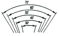 Угловые размеры наносят так, как показано на рисунке 4.19. В зоне, расположенной выше горизонтальной осевой линии, размерные числа помещают над размерными линиями со стороны их выпуклости; в зоне, расположенной ниже горизонтальной осевой линии ‒ со стороны вогнутости размерных линий. В заштрихованной зоне (см. рисунок 4.19) и при малом расстоянии между выносными линиями (рисунки 4.20, 4.21) наносить размерные числа не рекомендуется. В этом случае размерные числа указывают на горизонтально нанесенных полках.