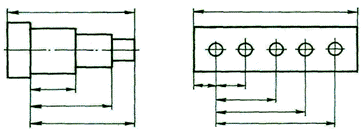 Размеры, определяющие расположение сопрягаемых поверхностей, проставляют, как правило, от конструктивных баз с учетом возможностей соблюдения и контроля этих размеров. При расположении элементов предмета на одной оси размеры, определяющие их взаимное расположение, наносят: от общей базы (рисунок 4.32), от нескольких баз (рисунок 4.33), цепочкой (рисунок 4.34).
