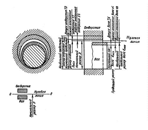 Термины отверстие и вал применяются не только для элементов деталей цилиндрической формы круглого сечения, но и для элементов деталей другой формы, например, призматических шпонок, пазов прямоугольного сечения. Предельные отклонения (в миллиметрах) проставляются на чертеже в виде: