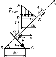 Розв’язання. Розподілене навантаження замінимо зосередженою силою , яку прикладемо у точці балки на відстані (бо центр ваги трикутника , по якому розподілена сила , знаходиться на відстані