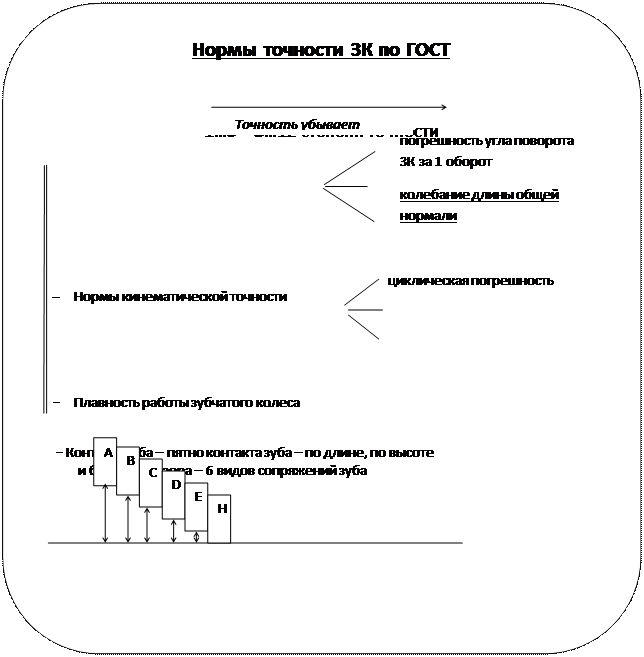 Детали зубчатых и червячных передач должны изготовляться с соблюдением определенных технических требований: 1. Точность базового отверстия до нарезания зубьев – 7 IT, а для прецизионных ЗК – 5 – 6 степени точности по 5 – 6 IT с шероховатостью Ra = 0, 3... 0, 6 мкм. 2. Допуски на изготовление ЗК задают в зависимости от степени точности ЗК по ГОСТ 1643 - 81 3. Допуск на радиальное биение зубчатого венца Fr колеса устанавливается в зависимости от степени точности, делительного диаметра и модуля ЗК (m = 3, 5 – 6, Ø 50 – 125 мм, биение – 0, 019 мм для 5-й степени точности, для 6-й – 0, 03 мм, для 7-й – 0, 042 мм, для 8-й – 0, 053 мм и т.д.) 4. Допуск на накопленную погрешность шага Fp по зубчатому колесу с диаметром делительной окружности 80 – 20 мм и модулем 1 – 6 мм для 5-й степени точности – 0, 022 мм, для 6-й – 0, 034 мм, для 7-й – 0, 048 мм, для 8-й – 0, 067 мм. 5. Обеспечение перпендикулярности торца к оси отверстия (по таблицам в зависимости от Ø и степени точности) 6. Биение окружности выступов для колёс диаметром 50 – 200 мм не более 0, 015…0, 030 мм для 6 – 7 степени точности 7. Биение по торцам колес перед окончательным шлифованием зубьев для 5-й степени точности – не более 0, 003 мм, для 6-й – 0, 005 мм. 8. По шероховатости боковая поверхность зубьев колес должна изготавливаться с Ra = 0, 6... 1, 2 мкм, червяков – Ra = 0, 2... 0, 4 мкм. Наибольшее распространение получили зубчатые колеса 5... 8-й степеней точности, для которых рекомендуется частота вращения 2, 5... 40 м/с. Зависимость степени точности, параметра шероховатости Ra, частоты вращения и величины пятна контакта зуба (h и /) показана в таблице