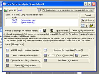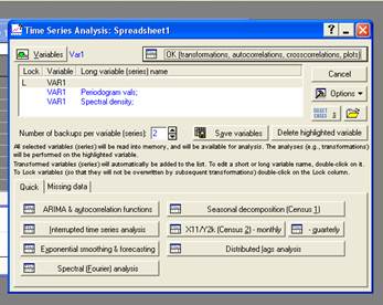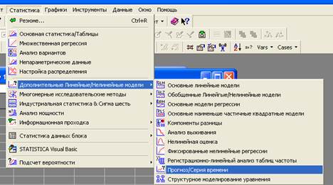 Рисунок 3. Запуск модуля Прогноз/Серия времени Модель АРПСС. Вначале найдем сезонный лаг при помощи спектрального анализа Фурье. Для этого в модуле выберите Фурье (спектральный) анализ, а затем постройте график периодограммы или спектральной плотности, так же можно воспользоваться численными значениями данных показателей.