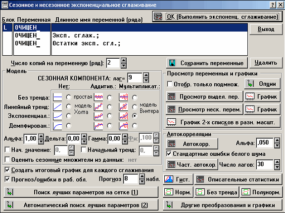 Рисунок 17. Задание параметров экспоненциального сглаживания. Также стоит заметить, что данная модель является более слабой по сравнению с предыдущей. Из проведенного анализа мы знаем, что сезонный лаг равен 9. Далее ввиду растущих размахов определяем модель как мультипликативную. Выбираем экспоненциальный тренд. Находим наилучшие компоненты. Строим модель с прогнозом на 8 лет.экспоненциального сглаживания.