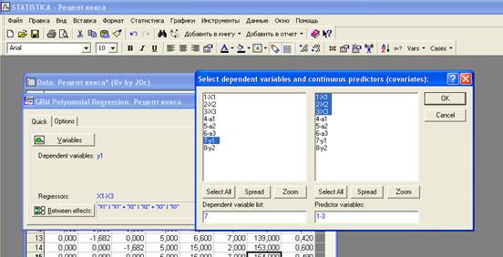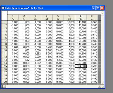 Постановка задачи Цель исследования – изучение влияния рецептурных компонентов на качество кекса, разработка оптимального состава изделия повышенной пищевой ценности. Исходные данные: Зависимые переменные (показатели качества кекса): y 1 - удельный объем изделия, см3/100 г; y 2 - объемная масса теста, г/см3 Независимые переменные (факторы, влияющие на показатели качества кекса): a 1 - дозировка сухой пшеничной клейковины, %; a 2 - дозировка молока сухого цельного, %; a 3 - дозировка яичного порошка, %; ai – натуральные значения факторов Xi – кодированные значения факторов X 1 – (a 1-5)/2 X 2 – (a 2-15)/5 X 3 – (a 3-7)/3