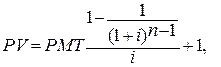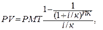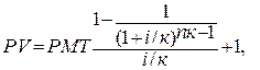Третья функция: текущая стоимость аннуитета. Аннуитет – это серия равновеликих платежей (поступлений) отстоящих друг от друга на один и тот же промежуток времени. Принято различать обычный и авансовый аннуитеты. В том случае, если платежи (поступления) производятся в конце каждого периода, говорят об обычном аннуитете. Базовые формулы: а) при платежах (поступлениях) в конце каждого года: