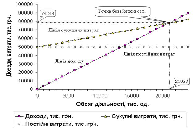 За результатами розрахунків фінансового результату за двома звітами необхідно узгодити результати з визначенням переваг та недоліків методів калькулювання «Директ-костинг» та повної собівартості. 5. Визначення точки беззбитковості за допомогою рівняння та графічно (побудувати в Microsoft Excel) з використанням бухгалтерської моделі беззбитковості та виконання інших розрахунків згідно з вхідними даними. Одним з методів визначення точки беззбитковості – є її визначення за допомогою рівняння. Для розрахунку використовується базове рівняння: ДОХІД = ВИТРАТИ + ВАЛОВИЙ ПРИБУТОК; Трансформоване базове рівняння для визначення точки беззбитковості виглядає наступним чином: ДОХІД = ВИТРАТИ. Функція доходу: У = Ц × Х, функція витрат: У = А × Х + В, де У – дохід, витрати, грн.; Ц – ціна за одиницю продукції, грн.; Х – обсяг реалізованої продукції, од.; А – змінні витрати на одиницю продукції, грн.; В – загальні постійні витрати, грн. Точка беззбитковості дорівнює: Х = В ÷ (Ц – А). Функція доходу за даними підприємства: У = 3, 72 × Х. Функція витрат за даними підприємства: У = 1, 349 × Х + 49 868 000. 3, 72 × Х = 1, 349 Х + 49 868 000. Х = 49 868 000 ÷ (3, 72 – 1, 349) = 21 033 (тис. од.) – точка беззбитковості в натуральних одиницях. У = 21 033 × 3, 72 = 78243 (тис. грн.) – точка беззбитковості в грошових одиницях. На рисунку 4.6 представлено розрахунок точки беззбитковості за допомогою рівняння в Microsoft Excel. Усі інші розрахунки виконуються за допомогою базового рівняння. Розрахунок обсягу реалізації цегли для одержання 217 тис. грн. прибутку після оподаткування (ставка податку на прибуток – 19%): 3, 72 × Х = 1, 349 × Х + 49 868 000+ 217 000 ÷ 0, 81; Х = 21146 (тис.од.). Отже, для того, щоб одержати 217 тис. грн. прибутку після оподаткування, необхідно реалізувати 21146 тис. од. цегли. Розрахунок запасу міцності при фактичному обсязі реалізації 30 000 тис. од.: - запас міцності в натуральних одиницях: 30 000 - 21 033 = 8967 (тис. од.);
