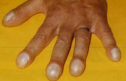 Ответы: Бронхография. 1) Основные рентгенологические изменения при бронхоэктатической болезни – единичные или множественные расширения бронхов различной формы (цилиндрические, мешотчатые, веретенообразные и смешанные). На иллюстрации представлены мешотчатые бронхоэктазы в виде округлых или овальных полостей, располагающиеся по ходу соответствующих бронхов. 2) У пациента на иллюстрации пальцы имеют вид барабанных палочек, а ногти – часовых стекол. Это связано с хронической интоксикацией и гипоксемией.