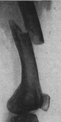 1) Бедренная кость. На рентгенограмме бедра в боковой проекции – косой перелом диафиза бедренной кости со смещением отломков. Признаки: наличие линии перелома, смещение отломков.