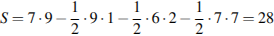 Решение. Площадь треугольника равна разности площади прямоугольника и трех прямоугольных треугольников, гипотенузы которых являются сторонами исходного треугольника. Поэтому