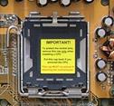 Розглянемо, де ж на платі розташовані ці компоненти. Відразу в очі впадає роз'єм для процесора, на який наклеєна захисна жовта наклейка, що одночасно закликає до обережності при установці чіпа.