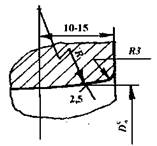 6.3.1. После окончательной обработки новые и старогодние колесные центры, цельнокатаные и зубчатые колеса, центры зубчатых колес должны иметь шероховатость поверхностей и размеры в полном соответствии с чертежами, техническими условиями и настоящей Инструкцией. Зубья зубчатых колес (венцы) должны быть проверены магнитным дефектоскопом. 6.3.2. При насадке нового центра на старую ось для обеспечения требуемого натяга диаметр отверстия ступицы разрешается выполнять в соответствии с диаметром подступичной части оси. 6.3.3. Во избежание задиров при запрессовке и распрессовке отверстия ступиц должны иметь запрессовочный конус с закруглениями кромок согласно чертежам. Предпочтительно выполнять заходную часть отверстия ступиц длиной 10 — 15 мм скругленой, радиусом (рис. 4); величина которого определяется по формуле: R = (1±0, 06) D0n,