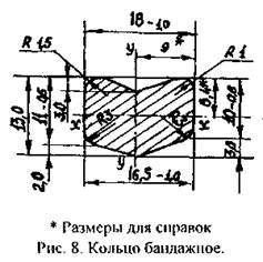 6.6.1. Снятие старогодних бандажей производится нагреванием бандажа до температуры не выше 300°С. Перед нагревом бандажа выбить или вырезать на станке бандажное кольцо. Негодные бандажи разрешается разрезать газовой горелкой с соблюдением особой осторожности с целью недопущения повреждения обода колесного центра. Рекомендуется снятие бандажей после вырезки бандажного кольца прессовым способом. Запрещается применение искусственного охлаждения колесных центров после снятия с них бандажей и самих бандажей (старогодних). 6.6.2. Расточенные новые или старогодние бандажи, а также центры обмерить для проверки натяга, непостоянства диаметра в поперечном и продольном сечениях. В случае конусообразности внутренней поверхности бандажа ее направление должно совпадать с направлением конусообразности цилиндрической поверхности обода колесного центра, причем разница значений отклонений непостоянства диаметров в продольных сечениях бандажа и обода должна быть не более 0, 05 мм, а больший натяг на ширине бандажа должен приходиться на его наружную часть. Запрещается производить обмер не остывших до температуры окружающего воздуха бандажей и центров. Внутренняя обработанная поверхность нового бандажа должна быть проверена магнитным дефектоскопом или ультразвуковым дефектоскопом в случае использования бандажа с наплавленной поверхностью. (В редакции указания МПС России от 23.08.2000 № К-2273у) 6.6.3. Нагрев бандажей для насадки на центр производится на электрическом или газовом горне, обеспечивающем равномерный нагрев до 250 — 300°С. Разность температур различных участков бандажа при нагреве допускается не более 50°С. Контроль температуры нагрева осуществляется по диаграмме нагрева или термоиндикаторными карандашами, а также другими приборами и устройствами, позволяющими контролировать температуру бандажа и автоматическое отключение нагревателя, не допуская превышение температуры нагрева бандажа. 6.6.4. Результаты измерения температуры нагрева бандажа, знаки заводов-изготовителей насаживаемого бандажа и оси колесной пары заносятся в цеховой журнал учета насадки бандажей и заверяются подписями исполнителя и мастера. В случае насадки бандажей на центры без оси вместо маркировки оси записывается в цеховой журнал заводская маркировка центра. (В редакции указания МПС России от 23.08.2000 № К-2273у) 6.6.5. Внутреннюю поверхность бандажа и наружную поверхность обода колесного центра перед нагревом протереть сухой чистой ветошью. 6.6.6. Запрещается: — производить насадку бандажей вне помещения; — насаживать на центры неравномерно нагретые бандажи; — насаживать бандажи на центры, у которых отверстия ступиц окончательно расточены под запресовку осей; — при смене бандажей ставить прокладки между бандажом и ободом. 6.6.7. Укрепление бандажей на колесных центрах производить бандажным кольцом из проката по ГОСТ 5267.10-90 (рис. 8). Кольцо заводить в выточку бандажа только утолщенной стороной. Бандажное кольцо сгибать на специальном станке из цельного или составного куска, состоящего не более чем из четырех частей, сваренных на контактной машине, газовой или электросваркой с зачисткой швов заподлицо. Запрещается сваривать встык бандажное кольцо, заведенное в паз, или приваривать его к бандажу или ободу колесного центра. 6.6.8. Бандажное кольцо заводится в в