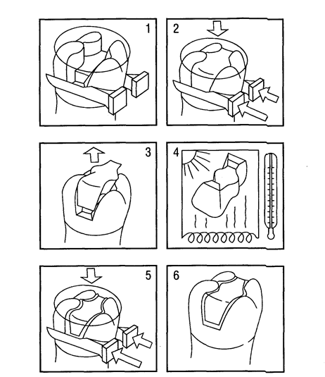 Рис. Етапи виготовлення вкладки: 1. Порожнина для вкладки (inlay) з матрицею і світловими клинами. 2. Полімеризація нанесеного композита. 3. Видалення композитної вкладки після полімеризації. 4. Эктраоральна світло/термополімеризація. 5. Нанесення цементу. 6. Зацементована вкладка. Для виготовлення вкладок непрямим методом використовуються наступні матеріали: Brillant (Coltene), Charisma (Kultzer), Degufill Ultra (Degussa), Dentofill (Lek), Herculiite XR (Kerr), Prisma APH, Prisma TPH (De Trey), Arabesk (Voco), Tefric (Vivadent), Compolay (Wilde), EOS, Heliomolar, SR-lsosit inlay-Onlay (Vivadent), Kultzer Inlay LS. I/Is peKOMeHuyeMbix u, eivieHTOB flna saKpenneHMfl BKJiaflOK CJienyeT BbineJiiiTb Dual Cement (Vivadent), Lekocem (Lek), Duofix (Voco), Compto-Cement Porcelite Dual Cure (Kerr), Duo Cement (Coltene).