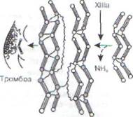 рез которую содержимое органелл выбрасывается наружу. Появление в кровотоке компонентов тромбо-цитарных гранул приводит к активации соседних интактных тромбоцитов, приклеиванию их друг к другу и к поверхности адгезированных клеток, а в конечном счете - к формированию крупных агрегатов, составляющих основу тром-боцитарного тромба. Одновременно возникает спазм сосуда, вызванный локальным выделением тромбоксана А2 и других вазоактивных веществ. На практике наибольшее диагностическое значение для выявления повышенной агрегации придается высвобождению в кровоток компонентов плотных телец: АДФ, серотонина, Р-тром-боглобулина и 4-го фактора. Важную роль играет и уровень 3-го тромбо-цитарного фактора, отражающего изменения топографии мембранных фосфолипидов, экспозицию на поверхности тех из них, которые в норме находятся в «глубине» плазматической мембраны. К ним, в частности, относится фос-фатидилсерин, мигрирующий на наружную поверхность мембраны тромбоцитов взамен сфин-гомиелина по типу «флип-флоп». Агрегация тромбоцитов не развивается в отсутствие внеклеточного Са2+, фибриногена и белка, природа которого пока не выяснена. Последний, в частности, отсутствует в плазме крови больных тромбастенией Гланцмана. Заключительная стадия тромбогенеза связана с активацией контактных факторов плазменного гемостаза, которые адсорбируются на поверхности агрегированных тромбоцитов и запускают «внутренний каскад» свертывания крови, завершающийся выпадением нитей стабилизированного фибрина и консолидацией тромба.
