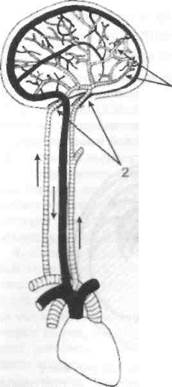 1 Рис. 49. Сосудистые эффекторы регулирования мозгового кровообращения -системы пиальных и магистральных артерий: - пиальные артерии, посредством которых регулируется величина микроциркуляции (соответствующая интенсивности обмена веществ) в небольших участках мозговой ткани; - магистральные артерии мозга (внутренние сонные и позвоночные), посредством которых поддерживается постоянство кровяного давления, кровотока и объема крови в кровеносной системе головного мозга при нормальных и патологических условиях ными и позвоночными. Однако когда реакции этих сосудов недостаточны, чтобы поддержать постоянство мозгового кровотока (а вследствие этого микроциркуляция становится_неадекш|т-ной метаболи ческим потребностям мозговой тка-_ ни), в регулирование включаются реакции более мелких артерий мозга, в частности пиаль-ных, расположенных на поверхности больших полушарий (рис. 49). Выяснение конкретных эффекторов этого регулирования позволило проанализировать физиологический механизм вазомоторных реакций мозговых сосудов. Если первоначально предполагали, что вазоконстрикция в мозге при гипер-тензии и вазодилятация при гипотензии связаны только с миогенными реакциями самих мозговых артерий, то сейчас накапливается все больше экспериментальных доказательств, что эти сосудистые реакции осуществляются нейроген-но, т. е. обусловлены рефлекторным вазомоторным механизмом, который приводится в действие изменениями кровяного давления в соответствующих отделах артериальной системы головного мозга. 8.6.2. Нарушения и компенсация мозгового кровообращения при венозном застое крови Затруднение оттока крови из сосудистой системы головного мозга, вызывающее в нем венозный застой крови (см. разд. 8.3), весьма опасно для мозга, находящегося в герметически замкнутой черепной коробке. В ней помещаются две