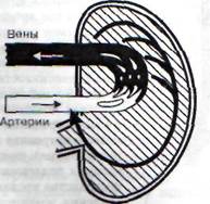 Рис. 50. Вено-вазомоторный рефлекс с механорецепторов венозной системы, регулирующих постоянство объема крови внутри черепа на магистральные артерии мозга несжимаемые жидкости - кровь и цереброспинальная жидкость, а также ткань мозга (состоящая на 80% из воды, потому малосжимаемая). Увеличение объема крови в сосудах мозга (которое неизбежно сопутствует венозному застою крови) вызывает повышение внутричерепного давления и сдавление мозга, нарушая, в свою очередь, его кровоснабжение и функцию. Вполне естественно, что в процессе эволюции животного мира развился весьма совершенный регулирующий механизм, устраняющий такие нарушения. Экспериментами было доказано, что сосудистыми эффекторами этого механизма являются магистральные артерии мозга, которые активно суживаются, как только затрудняется отток венозной крови из черепа. Данный регулирующий механизм работает посредством рефлекса с механорецепторов венозной системы головного мозга (при увеличении в ней объема крови и кровяного давления) на его магистральные артерии (рис. 50). При этом наступает их констрикция, ограничивающая приток крови в мозг и венозный застой в его сосудистой системе, который может даже полностью устраняться. 8.6.3. Ишемия головного мозга и ее компенсация Ишемия в головном мозге, так же как в других органах, возникает вследствие сужения или закупорки просвета приводящих артерий (см. разд. 8.2). В естественных условиях это может зависеть от тромбов или эмболов в сосудистом просвете, стенозирующего атеросклероза сосудистых стенок или патологической вазоконстрик-ции, т.е. спазма соответствующих артерий. Ангиоспазм в головном мозге имеет типичную локализацию. Он развивается главным образом в магистральных артериях и других крупных артериальных стволах в области основания мозга. Это те артерии, для которых при нормальном функционировании (т.е. во время регулирования мозгового кровотока) более типичны кон-етрикторные реакции. Спазм более мелких ветвлений пиальных артерий развивается реже, поскольку наиболее типичными для них являются дилятаторные реакции при регулировании микроциркуляции в коре мозга. При сужении или закупорке отдельных артериальных ветвей головного мозга ишемия раз-