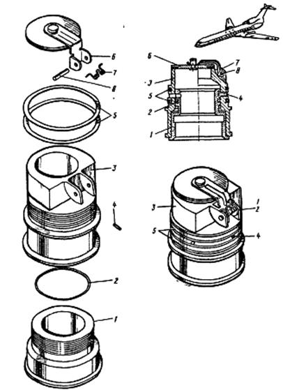 Рис.5. – однолепестковый обратный клапан, без штуцера, на рабочее давление 0, 12 МПа (1, 2 кгс/см2): 1 – основание клапана; 2, 5 – кольцо уплотнительное; 3 – корпус клапана; 4 – винт; 6 – клапан; 7 – пружина; 8 – ось. Выводы