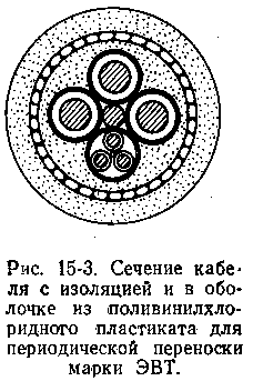 Для многократной прокладки в шахтах разработаны специальные полугибкие кабели с изоляцией и в оболочке из поливинилхло-ридного пластиката марки ЭВТ на напряжения 660 и 6 000 в переменного тока. Кабель имеет три основные жилы (сечением 10-95 мм 2), одну заземляющую (10 мм 2) и две - четыре вспомогательные жилы (2, 5 и 4 мм г). Токопроводящие жилы изготовляют медными многопроволочными (по типу II). Основные и вспомогательные жилы изолируют поливинилхлоридным пластикатом. Заземляющую жилу применяют неизолированной. Поверх изоляции основных жил накладывают экран из полупроводящего поливинилхлоридного пластиката или медной ленты. Вспомогательные жилы скручивают вокруг сердечника из поливинилхлоридного пластиката и обматывают медной лентой. Основные жилы и предварительно свитые вспомогательные жилы скручивают вокруг заземляющей жилы и накладывают поясную изоляцию. Затем накладывают броню - семипроволочные канатики из оцинкованной стальной проволоки диаметром не менее 0, 4 мм и оболочку из полившшлхлоридного пластиката (рис. 15-3). С целью упрощения конструкции кабеля возможна замена семипроволочных канатиков круглой оцинкованной стальной проволокой.