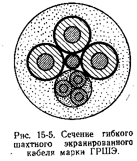 Шахтные гибкие кабели предназначены для присоединения передвижных машин и механизмов к сети переменного тока напряжением 660 в. Кабели предназначены для работы при температуре окружающей среды от -30 до +50° С. Длительно допустимая рабочая температура на жилах +66° С. Токопроводящие жилы кабелей ГРШЭ скручивают из проволок в стренги и из стренг в жилу в одну сторону (тип III). Скрутку основных жил и жил управления производят в левом направлении, а жил заземления - в правом направлении. Основные токопроводящие жилы изолируют резиной толщиной 1, 6-2, 2 мм с наложением поверх них полупроводящего слоя толщиной не менее 0, 3 мм. Экранирование основных жил в этих кабелях применяют с целью обеспечения безопасности труда в угольных шахтах. Экраны подключают к системе защиты кабеля, которая отключает кабель при повреждении его оболочки. Жилу заземления покрывают полупроводящей резиной. Жилы управления изолируют резиной толщиной 1, 0 мм. Основные жилы и жилы управления различаются расцветкой или маркировкой. Экранированные основные жилы и жилы управления скручивают вокруг жилы заземления с шагом не более 10 D. Направление скрутки - правое. Поверх скрученных жил накладывают ленту из полиэтилентерефталатной, полиамидной или другой синтетической пленки и оболочку из резины на основе полихлоропренового каучука толщиной 4-5 мм (рис. 15-5). Кабели изготовляют с тремя основными жилами сечением 4-70 мм 2, одной жилой заземления сечением 2, 5-10 мм 2 (в зависимости от сечения основных жил) и тремя жилами управления сечением 1, 5-4, 0 мм 2 (в зависимости от сечения основных жил). В шахтных кабелях при испытании на механическую, прочность к деформациям изгиба с кручением основные жилы речением 4-16 мм 2 выдерживают не менее 3 000 циклов, а жилы сечением 16-70 мм 2 - не менее 2000 циклов.