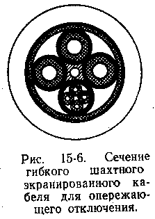 Для опережающего отключения кабельной линии в случае повреждения оболочки кабеля может быть применено экранирование кабелей одним или двумя экранами. Кабели с одним экраном аналогичны кабелю ГРШЭ (см. рис. 15-4), только число вспомогательных жил увеличено до пяти. В кабелях с двумя экранами один экран изолируют от другого и заземляют, а ко второму подводят напряжение. Механическое повреждение оболочки кабеля вызывает контакт между экранами. Срабатывание защиты происходит до начала повреждения изоляции токопроводящих жил. Конструкцией кабеля с опережающим отключением является кабель с индивидуальными полупроводящими экранами поверх токопроводящих и вспомогательных жил и общим полупроводящим экраном поверх поясной изоляции кабеля (рис. 15-6).