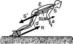 У всех локомоторных движений общая двигательная задача – усилиями мышц передвигать тело человека относительно опоры или среды. Среди передвижений относительно опоры (наземных передвижений) наибольшее распространение имеют шагательные. В водной среде применяется как отталкивание, так и притягивание. В некоторых видах спорта (спортивных играх, единоборствах, гимнастике и др.) локомоторные движения играют вспомогательную роль. Отталкивание от опоры выполняется посредством: При отталкивании опорные звенья неподвижны относительно опоры, а подвижные звенья под действием силы тяги мышц передвигаются в общем направлении отталкивания. Во время отталкивания легкоатлета от опоры стопа зафиксирована на опоре неподвижно. Шипы туфель, погружаясь в покрытие дорожки или брусок, обеспечивают надежное соединение с опорой. На стопу как на опорное звено со стороны голени действует давление ускоряемых звеньев тела, направленное назад и вниз. Через стопу оно передается на опору. Противодействием этому давлению служит реакция опоры. Она приложена к стопе в направлении вперед и вверх. Силы мышечных тяг толчковой ноги выпрямляют ее. Поскольку стопа фиксирована на опоре, голень и бедро передают ускоряющее воздействие отталкивания через таз остальным звеньям тела. При ускоренном движении подвижных звеньев на них воздействуют тормозящие силы (тяжести и инерции) других звеньев, а также силы сопротивления мышц-антагонистов. Реакция опоры при отталкивании является той внешней силой, которая обеспечивает ускорение телу спортсмена и передвижение его центра масс. Однако, тело человека – это самодвижущаяся система. В такой системе силы тяги мышц приложены к подвижным звеньям. Относительно каждого звена сила тяги мышцы, приложенная к нему извне, служит внешней силой. Следовательно, ускорения центров масс подвижных звеньев обусловлены соответствующими внешними для них силами, т.е. тягой мышц. Реакция опоры не является источником работы. По закону сохранения кинетической энергии изменение кинетической энергии равно сумме работ внешних и внутренних сил. Поскольку работа внешних сил (опоры) равна нулю, то кинетическую энергию спортсмена изменяет только работа внутренних сил (мышц). Реакция опоры при отталкивании под углом, отличающегося от прямого (не перпендикулярно к опорной поверхности), наклонены к опорной поверхности и имеют вертикальные и горизонтальные составляющие. Вертикальные составляющие обусловлены динамическим весом, т.е. суммой веса и сил инерции подвижных звеньев, имеющих ускорение (или его составляющую), направленное вертикально вверх от опоры. Горизонтальные составляющие реакций опоры обусловлены горизонтальными составляющими сил инерции подвижных звеньев. Контакт опорных звеньев с опорой не точечный, поэтому могут появиться и вращательные усилия, что усложнит схему реакции опоры. Маховые движения при отталкивании – это быстрые движения свободных звеньев тела в основном по направлению с отталкиванием ногой от опоры. При маховых движениях перемещаются центры масс соответствующих звеньев тела, что ведет к перемещению общего центра масс (ОЦМ) всего тела. Так, при прыжках в высоту в результате маховых движений руками и свободной ногой ОЦМ к моменту отрыва от опоры поднимается выше, чем без маховых движений. Если ускор