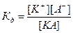 Процесс электролитической диссоциации удобнее характеризовать константой диссоциации, применив к нему законы химического равновесия. Так, для реакции КА↔ К++А– константа диссоциации величина