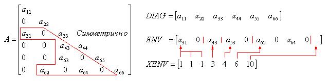 На рис.3 оболочка матрицы выделена ломаной линией. Профиль матрицы в этом примере равен 11. В профильной схеме хранения разреженной матрицы от каждой строки матрицы хранятся все элементы от первого ненулевого до диагонального (не включая диагональный). Эти отрезки строк размещены в последовательных позициях одномерного массива, диагональные элементы хранятся отдельным вектором. В схеме имеется основной массив