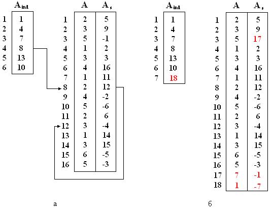 Соседи текущего узла в массиве располагаются в позициях, начиная с и заканчивая , таким образом, их поиск не является сложным, что есть очень значительным преимуществом рассмотренной схемы хранения. Однако внесение при необходимости изменений в структуру смежности графа очевидно вызовет затруднение. Действительно, добавление (исключение) узлов (ребер) из графа приведет к модификации не только списков смежности соответствующих узлов, но может потребовать изменения всего массива (и соответствующим образом ) (рис.4), что, конечно, не желательно.