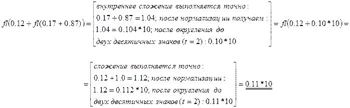 Таким образом, в рассмотренной системе с плавающей точкой (0.12+0.17)+0.87≠ 0.12+(0.17+0.87), что говорит о нарушении сочетательного закона сложения. В общем случае определение системы чисел с плавающей точкой приводит к тому, что результат арифметического выражения в ней зависит от порядка выполнения операций. Это значит, одному алгоритму, «записанному на бумаге», соответствует множество «машинных» алгоритмов, в каждом из которых другой порядок выполнения действий и, следовательно, может быть другой результат. При сложении машинных чисел различной величины результат может оказаться точно равен одному из слагаемых. Вполне можно было бы, не изменяя результата, заменить меньшее число нулем. Наименьшее число с плавающей точкой, которое при сложении с числом 1 дает результат, больший, чем 1, часто называется машинным эпсилоном и обозначается Машинный эпсилон определяет относительную погрешность арифметики компьютера. Если