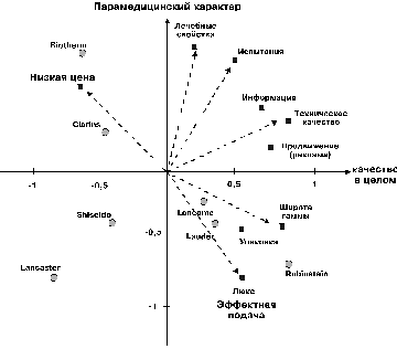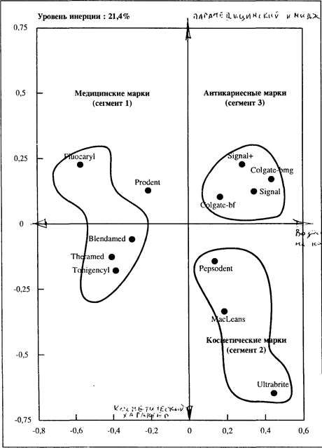 Рис. 6.5. Анализ рынка зубных паст в Бельгии. Обещание третьего сегмента более привлекательно, чем первого, поскольку акцент делается на более серьезный атрибут: предотвращение кариеса. Анализ данного типа позволяет исследователю рынка увидеть, как покупатели воспринимают различные марки, и убедиться в том, что избранное позиционирование действительно достигнуто. Эффективное позиционирование предусматривает проведение постоянных маркетинговых исследований покупательских предпочтений, мотивов совершения покупок, которые направлены на верный выбор аргументов позиционирования. Решение этой задачи также зависит от вида товара, типа целевой аудитории, положения товара в ряду конкурирующих и многих других факторов. При позиционировании используются те аргументы (преимущества), которые являются наиболее важными для потребителей. При определении позиции товара (услуги) на потребительском рынке, где число рассматриваемых аргументов может быть очень велико, маркетологи часто используют метод построения карт позиционирования, которые представляют собой матрицы, на полях которых представлены товары (услуги) конкурирующих предприятий. Достаточно подробную характеристику этого метода предлагают американские ученые R.E. Anderson, W.C. Black, J.F. Hair[40]. Они отмечают, что восприятие товаров и товарных марок потенциальными покупателями практически всегда основывается лишь на небольшом числе аргументов (атрибутов). Эти привилегированные атрибуты называют макрохарактеристиками или сокращенным набором атрибутов. Иллюстрирующая это утверждение карта восприятия (см. рис. 19) отражает восприятие со стороны женщин — потребителей торговых марок известных фирм, производящих косметические товары (Lancаster, Lauder, Lancome, Rubinstein, Biotherm, Clarins, Shiseido).
