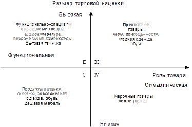 Для четырех полей карты характерны следующие сочетания: – функциональные товары с высокой наценкой и престижные товары, приобретение которых имеет символический смысл (поля II, III). Их предлагают престижные специализированные магазины с высоким уровнем качества обслуживания; – функциональные товары с низкой наценкой и марочные уцененные товары, имеющие символическое значение (поля I, IV). Их реализуют в магазинах повседневного спроса, часто имеющих смешанный ассортимент и невысокий уровень обслуживания. Задача розничного торгового предприятия — позиционировать себя на данной карте, после чего определить действия, позволяющие выделиться среди конкурентов в сознании потребителей. Может быть несколько вариантов позиционирования: товарная (продуктовая) дифференциация (поля II, III), основанная на предлагаемом ассортименте, который выгодно отличается от ассортимента других магазинов той же товарной категории; сервисная дифференциация, согласно которой магазин выделяется качеством предлагаемого обслуживания (поля II, III); ценовая дифференциация, которая состоит в предложении товаров по более выгодным ценам (поля I, IV). Цены, предлагаемые в магазине, — ключевой фактор конкуренции и одновременно отражение качества предлагаемых товаров. Поэтому очень важным элементом в позиционировании является качественно-ценовое позиционирование товаров и самой торговой фирмы на рынке.